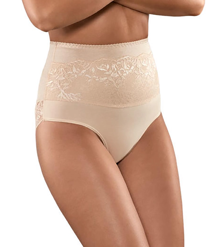 Babell light Control magas derekú, alakformáló csípőszorító bugyi, erős, nem nyújtható anyagból. Tökéletes a has leszorítására. A derék és a fenék finom csipkével díszített. Pamut az alsó része, ezért akár szülés után is jó választás. Kiváló minőségű európai termék.