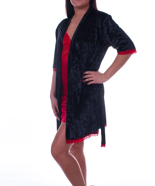 Buja hatást kelt ez a kimonó fazonú finom bársony női köntös, piros csipke szegéllyel, megkötővel. Anyaga:80%poliamid, 20%elastan. Mellbősége:108 cm, hossza:82 cm, ujja:29 cm