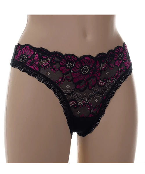 Fekete átlátszó pink csipkés női bugyi. Csipke szegéllyel. 95% pamut 5% elasztán. szélesség:62cm, magasság:20cm,
