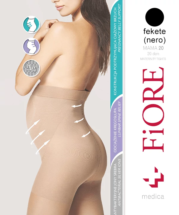 Fiore Mama Kismama vékony szálú harisnyanadrág. Optimálisan igazodik a pocakhoz, a növekvő súlyt elosztja. Nem terheli meg a hátat, derekat és az amúgy is igénybe vett gerincet. A Silver Fresh technológia a baktériumok és gombák szaporodását gátolja.