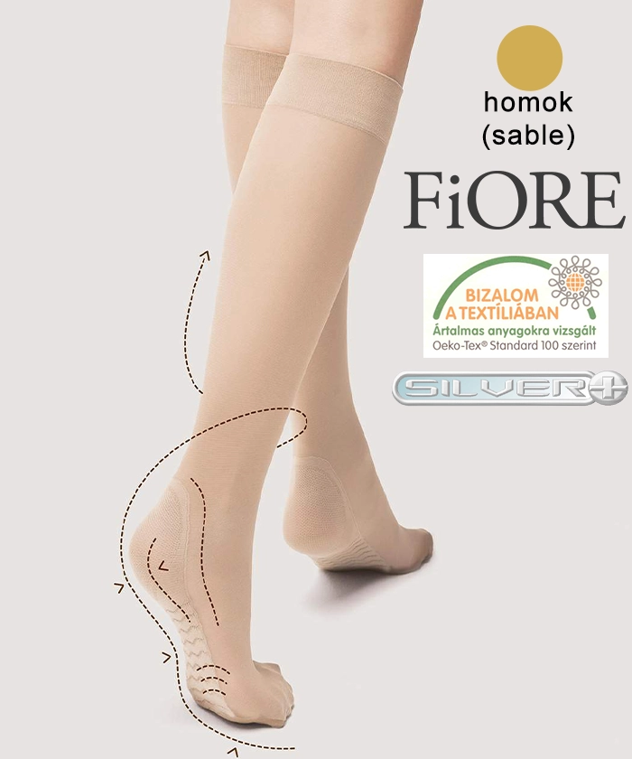 Fiore Massage gyógyhatású vékonyszálú nylon térdharisnya. Antibakteriális ezüst védelemmel ellátott. A megerősített szálú és bordázott talprész masszírozó hatása segítheti az egészséges vérkeringést. A vádlinál kényelmes gumirozású. Megerősített orr résszel. 1 páras, méret nélküli. Oeko-Tex Standard minőség