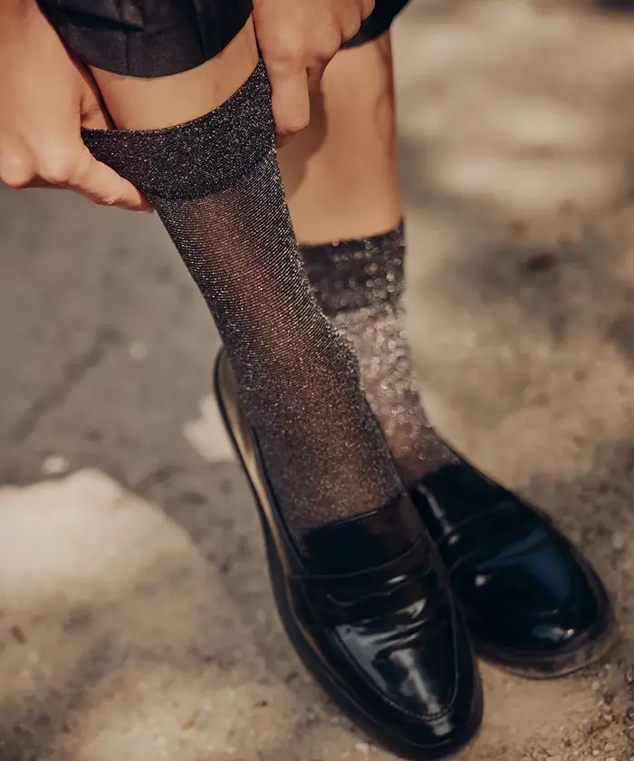 Exkluzív megjelenésű, extrán csillogó Gabriella Tova lurex szálas bokaharisnya. Bordázott, microfibra anyagú, kényelmes gumirozással. Nem szakad el könnyen. I. osztályú európai termék