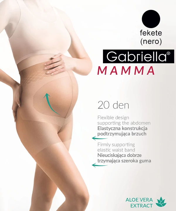 Gabriella 20 denes, vékonyszálú harisnyanadrág kismamák számára. Lapos varrással és megerősített orrrésszel készült. A gondosan illesztett hasi betét finoman támasztja a fontos részeket. A várandós hölgyek is hódolhatnak az eleganciának. Aloe vera kivonata a harisnyára érzékeny bőrűeknél megszünteti az esetleges viszketést. Szuper választás a hűvösebb időkben, és jobb takarást biztosít.