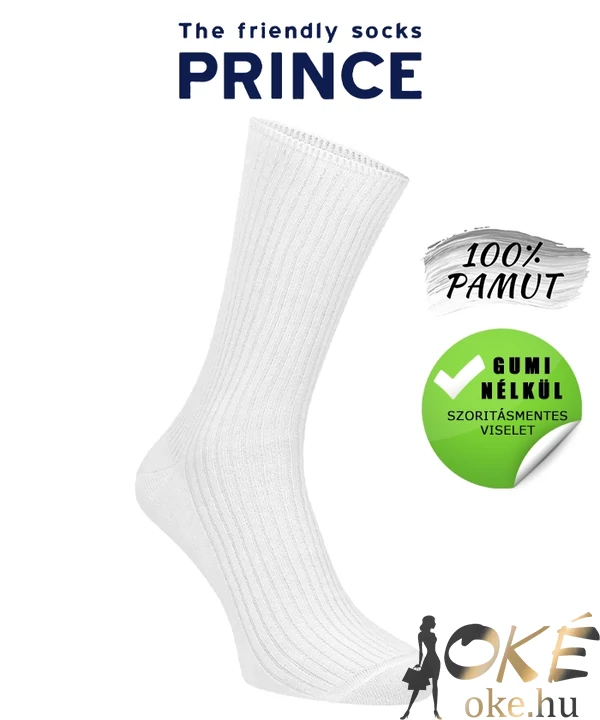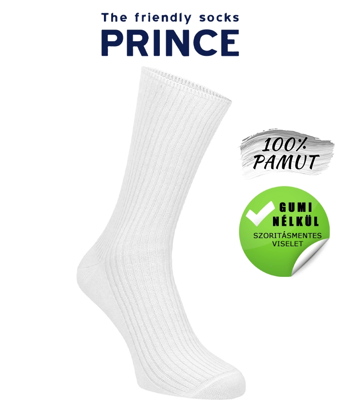 Prince Classic gumírozás nélküli, 100% pamut zokni. Teljesen műszál mentes, csak puha nedvszívó pamutot tartalmaz. Vizesedésre hajlamos lábra, vagy bakancsba is jó választás.