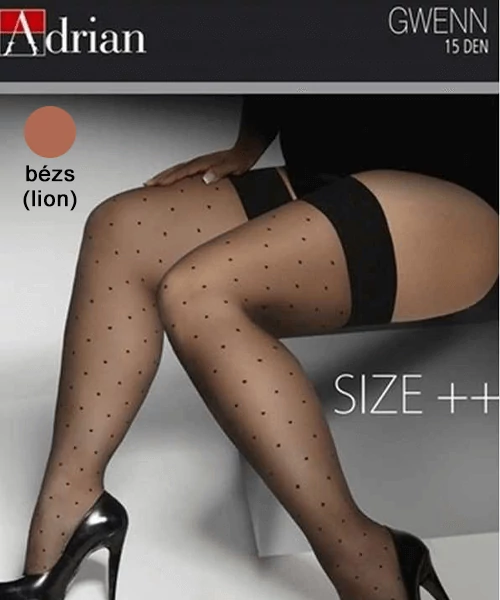 Imádjuk a pöttyöset! Adrian Gwenn extra méretű 15 den-es mintás combfix molett nők számára. Finom szálú, kellemesen selymes hatás, apró bézs pöttyökkel. Megerősített orrrésszel és szilikon csíkkal a magabiztos viseletért. Harisnyatartó nélkül hordható! Minőségi anyagokból Európában készült.