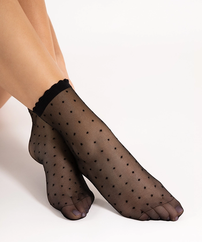 Fiore Bella vékonyszálú, apró pöttyös neylon bokazokni. Rugalmas gumirozású, egységes szálszövéssel. Orrerősítés nélkül. Oeko-Tex Standard minőség