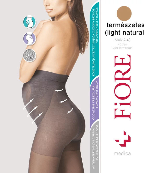 Fiore Mama Kismama harisnyanadrág, mely tökéletes kényelmet biztosít a várandós anyukáknak. Közepesen vastag, rugalmas, ezüstszálas, mikroszálas anyagú. Optimálisan igazodik a pocakhoz, a speciális derékrész a növekvő súlyt elosztja. Nem terheli meg a hátat, derekat és az igénybe vett gerincet.
