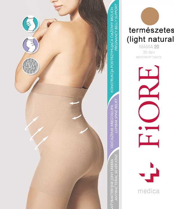 Fiore Mama Kismama vékony szálú harisnyanadrág. Optimálisan igazodik a pocakhoz, a növekvő súlyt elosztja. Nem terheli meg a hátat, derekat és az amúgy is igénybe vett gerincet. A Silver Fresh technológia a baktériumok és gombák szaporodását gátolja.