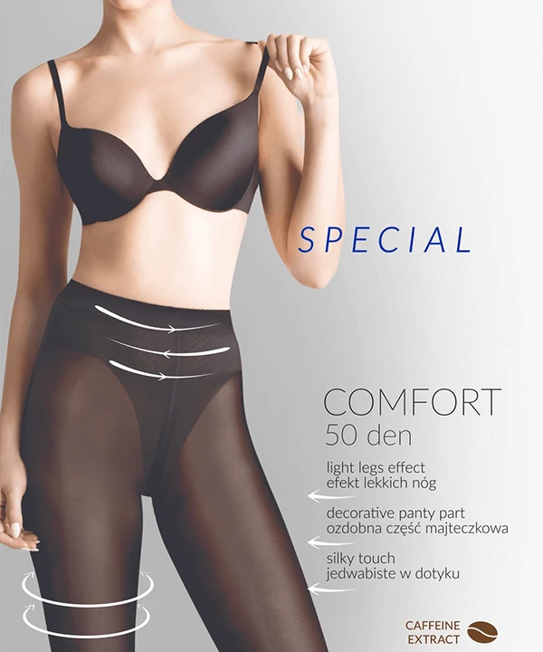 Gabriella Special Comfort 50 den, közepesen vastag, meleg harisnyanadrág. Selymes tapintású anyagból, tanga fazonú dekoratív nadrágrésszel készült, enyhe hasleszorító hatással. Viselése során, a fonalba juttatott koffein szabadul fel, ami a bőrön áthatolva segíti a cellulitisz csökkenését. Elől-hátul 1 varrásos.