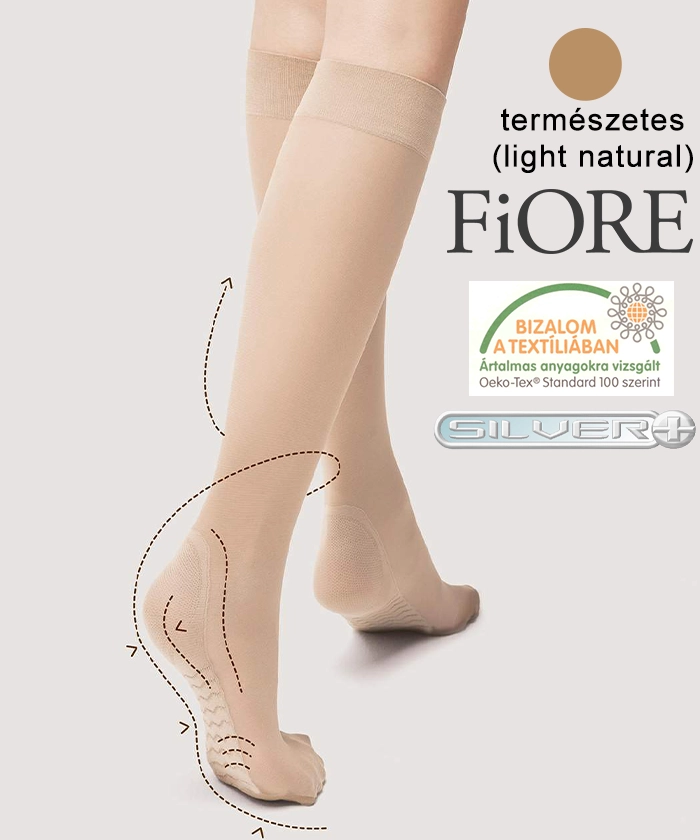 Fiore Massage gyógyhatású vékonyszálú nylon térdharisnya. Antibakteriális ezüst védelemmel ellátott. A megerősített szálú és bordázott talprész masszírozó hatása segítheti az egészséges vérkeringést. A vádlinál kényelmes gumirozású. Megerősített orr résszel. 1 páras, méret nélküli. Oeko-Tex Standard minőség