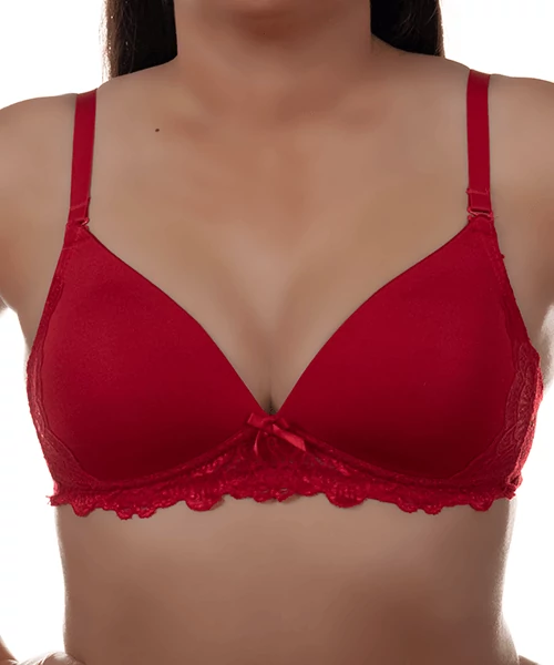 Lemila piros párnázott merevítő nélküli női melltartó. Kosár oldalán és hátsó pántján csipkével. Levehető, állítható pántos. Kettős horogkapoccsal mely három fokozatban állítható. mell alatti körméret: 63cm