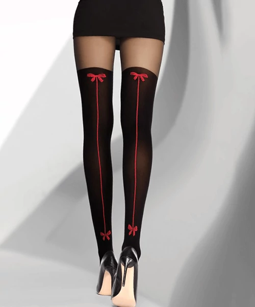 Livia Corsetti Amita combfix mintás női harisnya. Hátul piros csíkos masnis mintával 40 denes, felül egészen derékrészig 15 denes. Tangásított fazonú. I. osztályú minőség Európából.