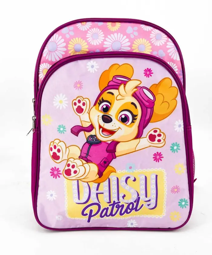 Paw Patrol hátizsák. 1 nagy cipzáras fiókkal, elől 2 kisebb cippes fiók, 2 hálós kulacstartó, párnázott hátfal és vállpántok, fényvisszaverő csíkkal. anyaga: polieszter Mérete:42x 32x 15 cm