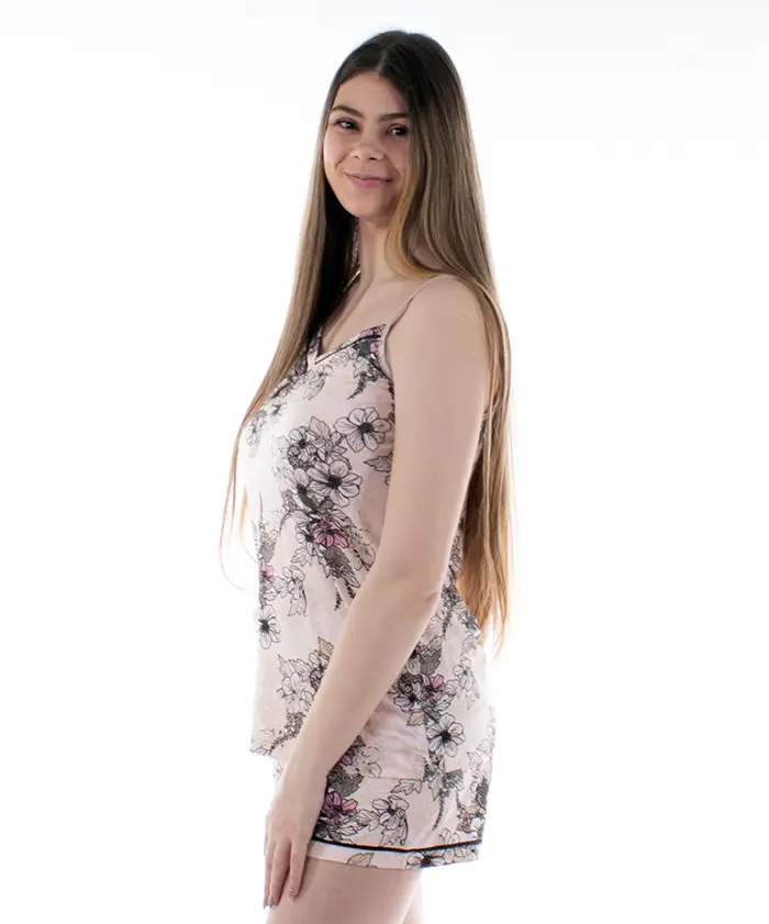 Bájos rövidnadrágos, vékony vállpántos női pizsama. Puha viszkóz anyagból készült, rugalmas szatén, állítható vállpánttal. mell:76-82 cm, hossz:58 cm, nadrág derék:56-66 cm,