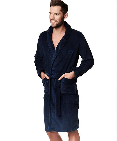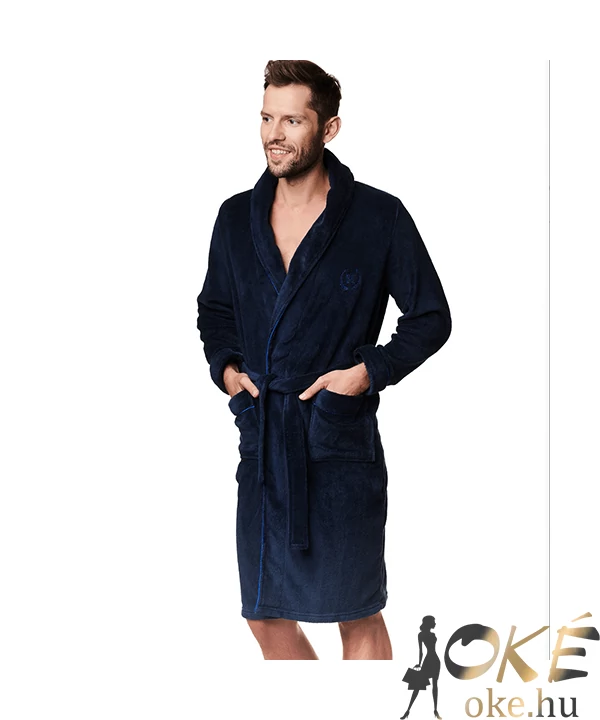 Kellemesen puha, vastag wellsoft anyagból készült férfi köntös, sálgallérral, paszpól szegéllyel, mellrésznél férfiasan elegáns hímzéssel. mellbőség:114 cm, hossz:116 cm, ujj:65 cm. Minőségi anyagokból Európában készült termék.