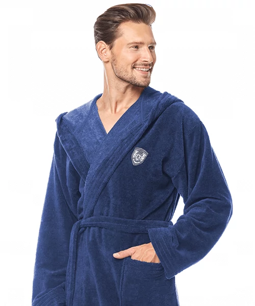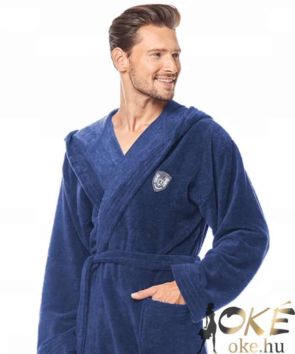Kellemesen puha, vastag wellsoft anyagból készült, klasszikus fazonú kapucnis férfi köntös, mellrésznél férfiasan elegáns hímzéssel, tűzött szegéllyel. Minőségi anyagokból Európában készült termék. mellbőség:118 cm, hossz:111 cm, ujj:57 cm. 168-174 test magasságra. Igényes csomagolásban szállítjuk.
