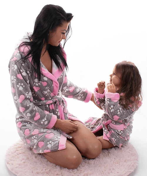 Puhaság szerelmeseinek! Plüss hatású pihe puha wellsoft női fürdőköpeny. Tappancsos nyomott mintás, 2 rávarrt zsebbel, övvel. A gyerek méretet itt találod.