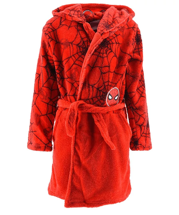 Új model! Marvel Pókember/Spiderman plüss hatású, pihe puha wellsoft anyagú, hímzett kapucnis, hímzett és nyomott mintás gyermek köntös, gumírozott derékrésszel, bevarrt övvel, 2 zsebbel. mellbőség:64 cm, hossz:54 cm, ujj:31 cm,