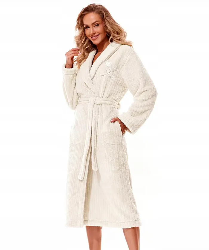 Elegáns welsoft hosszú női fürdőköpeny, mellrészén hímzéssel, 2 bevarrt zsebbel. Könnyen szárad, nem göbösödik. Nagyon jó meleg és nem nehéz. Minőségi anyagból, Európában készül.
