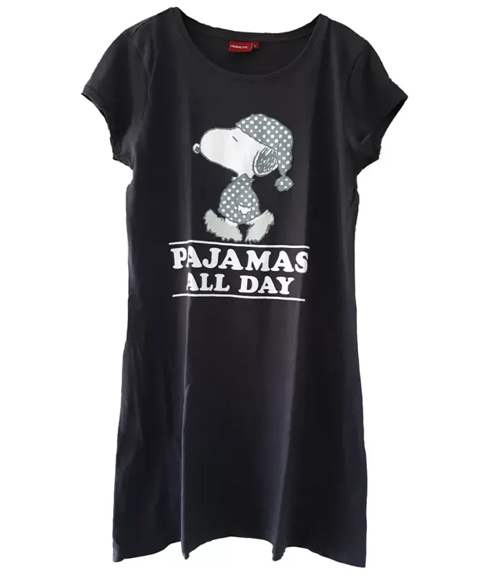 Snoopy mintás hálóing vagy pólóruha. Térd alá érő, bővülő fazonú. Puha vékony Oeko-Tex pamut anyagú. mellbőség:90-96 cm, hossz:93 cm,