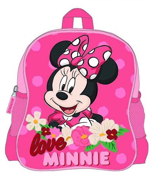 Disney Minnie Mouse hátizsák. 1 nagy cippes fiók, 2 hálós kulacstartó. Párnázott, állítható vállpánt. Erős, vízhatlan polieszter anyagból. mag:32 cm, szél:27 cm, mély:11 cm