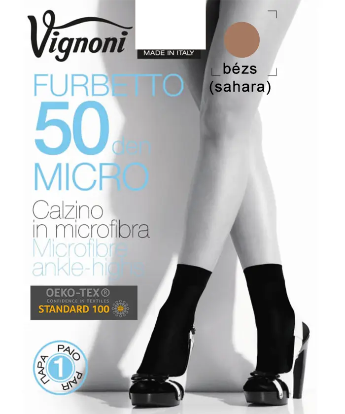 1 pár Vignoni közepesen vastag mikroszálas bokazokni. Széles gumirozással, pamut hatású, kellemes matt testszínben. Keskenyebb lábfejre ajánljuk. Oeko-Tex Standard 100 európai termék